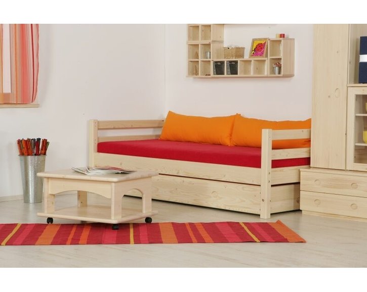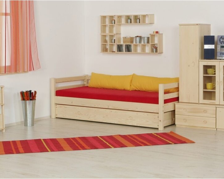 Postel je dodávána bez roštu a matrace 90x200 cm, bez textilních chráničů a bez zábran.