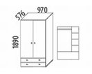 Šatní skříň je vybavena dvěmi zásuvkami, šatní tyčí a policemi.