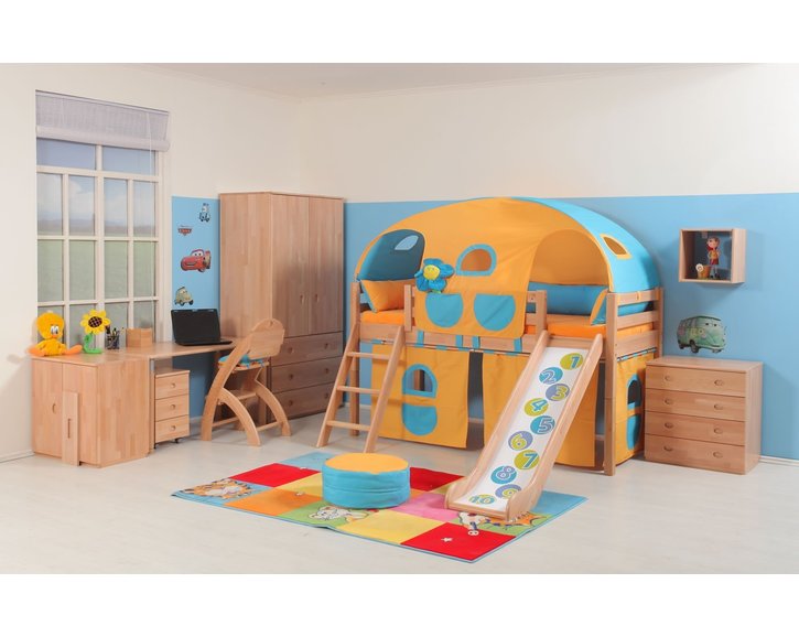 Textilní dekorace a komoda nejsou součástí ceny postele. Jako příslušenství doporučujeme dokoupit látkový stan a domeček, které jsou k dostání v různých veselých barvách jak pro holku, tak pro kluka. Látkový domeček poskytuje dětem k jejich hrám potřebný pocit soukromí.