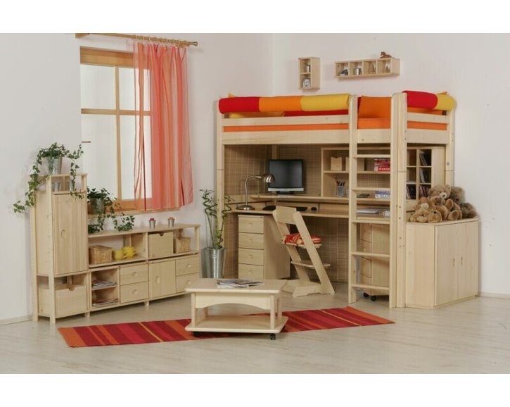 Tato dětská patrová postel z masivu se vyznačuje vysokou kvalitou zpracování a zaujme svým vzhledem. Postel svou konstrukcí nabízí kombinaci odpočinkového a zároveň pracovního prostoru. Postel nabízí velké množství doplňkového sortimentu - lezecká stěna, houpačka, textilie či nábytek vyrobený ve stejném designu vytvoří z postele jedinečný kus nábytku v každém dětském pokoji.