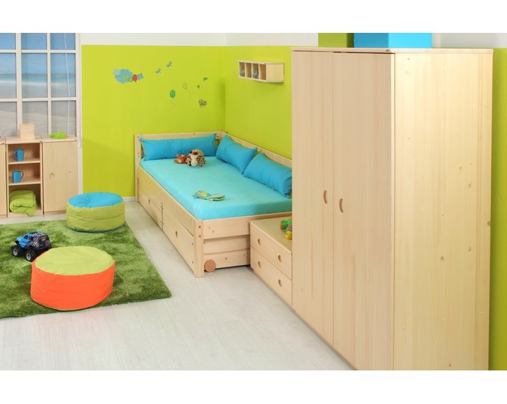 V ceně dětské postele je dřevěná zadní zábrana, kterou je vhodné doplnit o textilní chrániče. Pod postel lze umístnit úložné prostory - šuplíky poloviční, tříčtvrteční nebo po celé délce. K posteli můžete dokoupit také přistýlku. Pro malé děti můžete k posteli na přední stranu dokoupit dětskou zábranu.