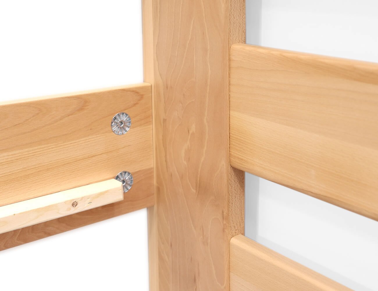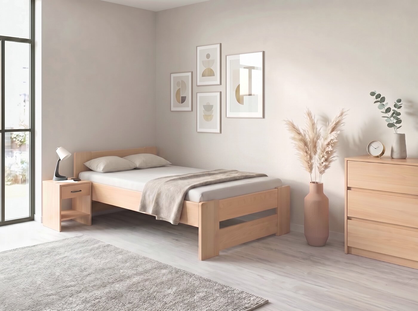 Na posteli MIVA oceňuji zejména kombinaci průběžného bukového masivu (žádný cink/parketové provedení) a konstrukce bez zbytečných komplikací. Právě absence úložného prostoru je v tomto případě výhodou – postel působí vzdušněji, lehčeji a konstrukčně velmi čistě.