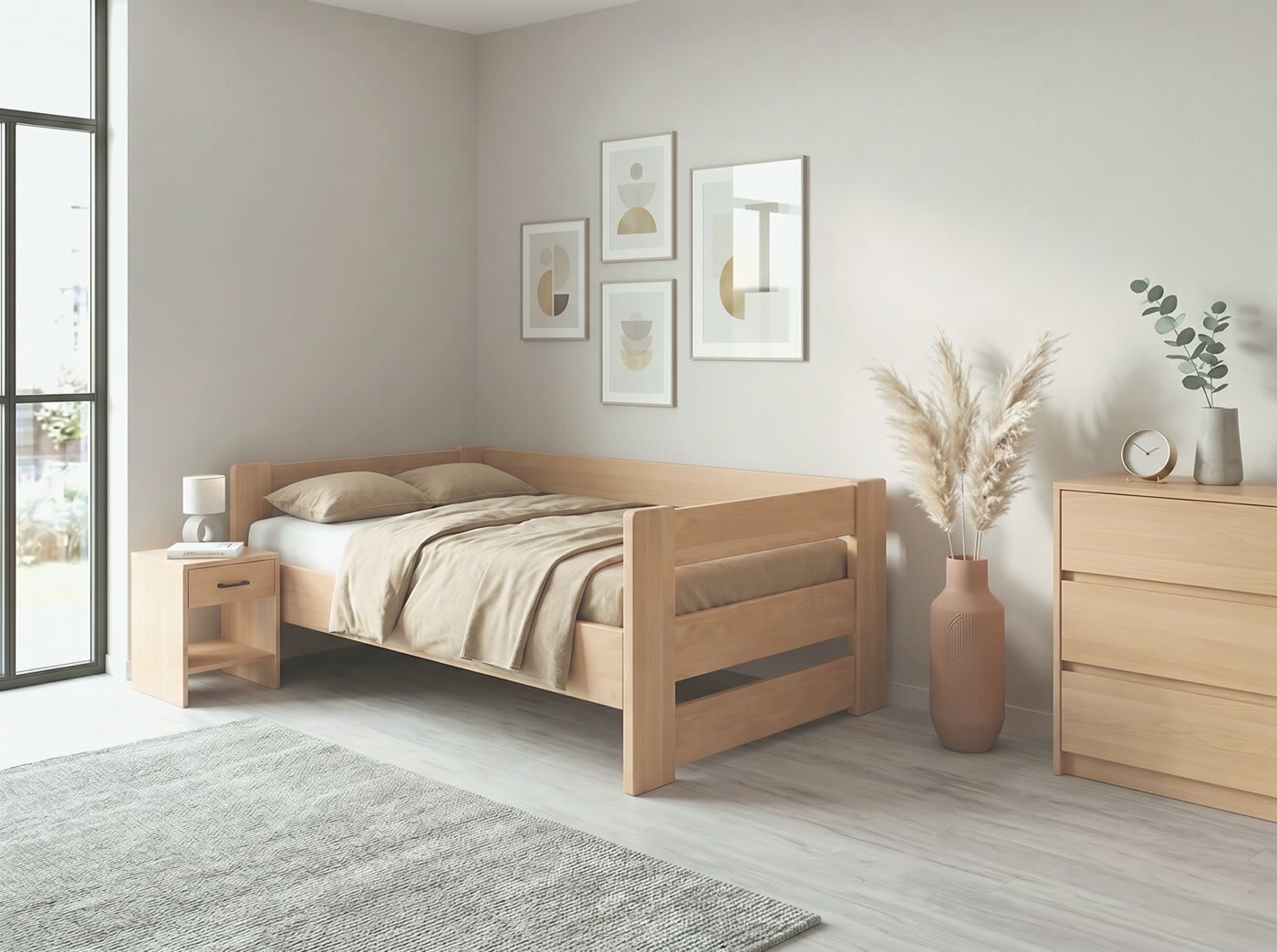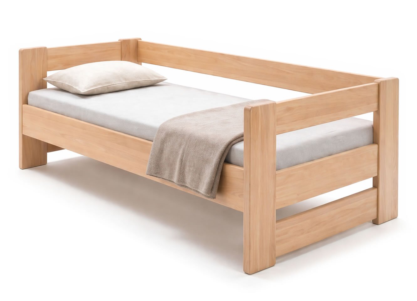 Na posteli MIVA oceňuji zejména kombinaci průběžného bukového masivu (žádný cink/parketové provedení) a konstrukce bez zbytečných komplikací. Provedení se třemi čely do „U“ je praktické nejen do dětských a studentských pokojů, ale i do menších ložnic nebo pokojů pro hosty, kde může postel sloužit také jako pohodlné denní lůžko. Právě absence úložného prostoru je v tomto případě výhodou – postel působí vzdušněji, lehčeji a konstrukčně velmi čistě