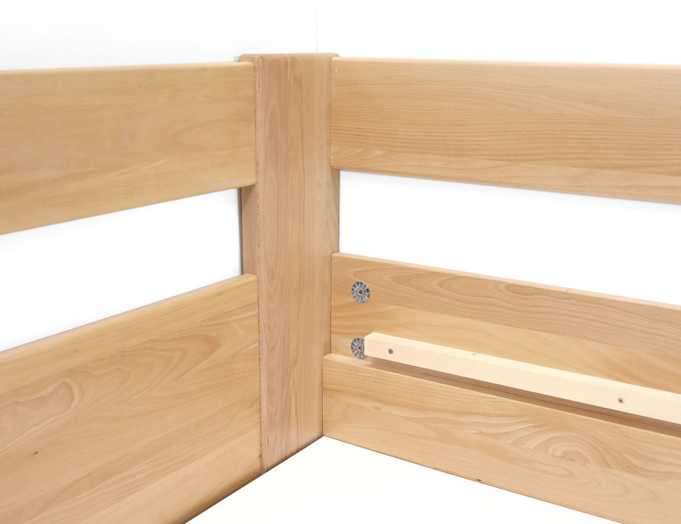 Povrchová úprava ekologickým lakem je u MIVY provedena velmi precizně, dřevo je hladké a příjemné na dotek. Rohové spojení pomocí dvojitého hákového kování je natolik pevné, že se postel ani po letech nepohne. Pokud bych měl něco vytknout, byla by to absence výškově stavitelného kování pro rošty, ale chápu, že pro zachování takto příznivé ceny a tuhosti konstrukce je stávající řešení optimální.