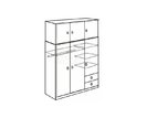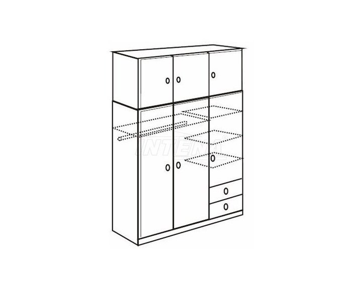 Skříň je rozdělena na dvě části, kdy na jedné straně je prostor s policí a šatní skříňí k pověšení kabátů a je uzavřen dvěmi dvířky. Ve druhé části skříně je prostor s třemi nastavitelnými policemi uzavřen dvířky, pod kterými se nacházejí ještě dvě zásuvky na kovových pojezdech.