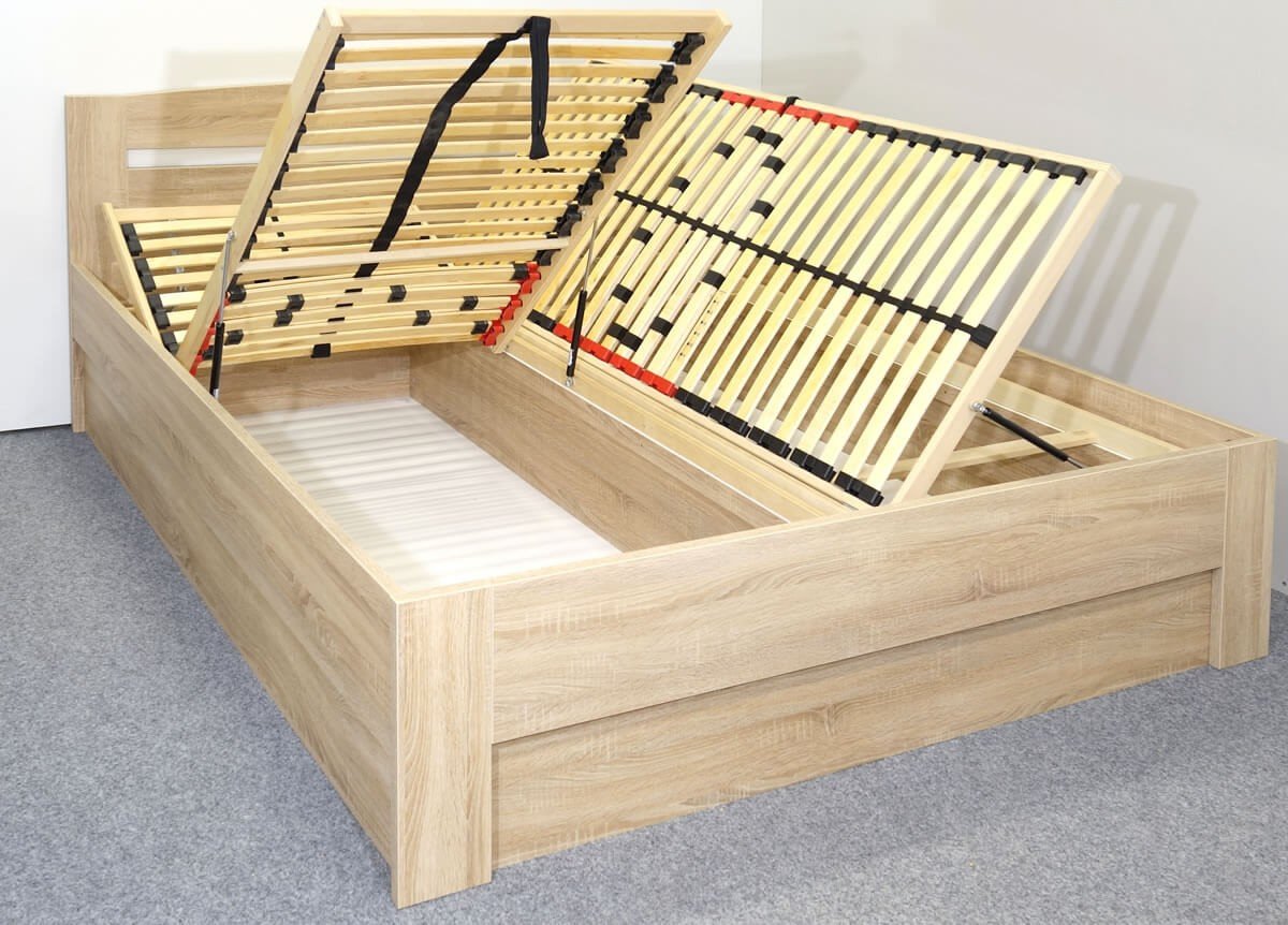 Do úložného prostoru se dostanete pomocí výklopných lamelových roštů, které mohou být čelně nebo bočně výklopné. Čelně výklopné rošty se vyklápějí od nohou postele a nabízí také možnost mechanického polohování hlavy. Bočně výklopné rošty polohování hlavy nemají.