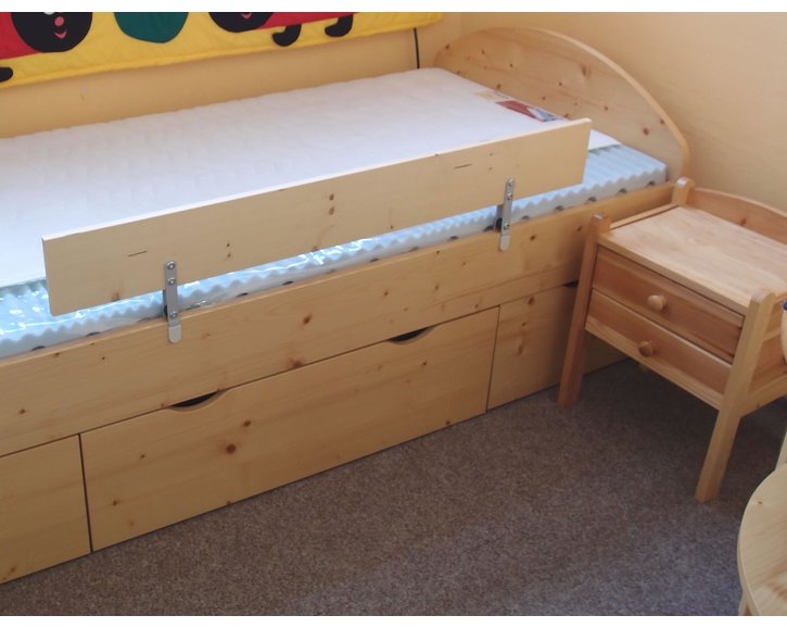 Kvalitní univerzální zábrana k většině dětských postelí - použití na všechny tloušťky bočnic. Provedení lakovaný smrk.