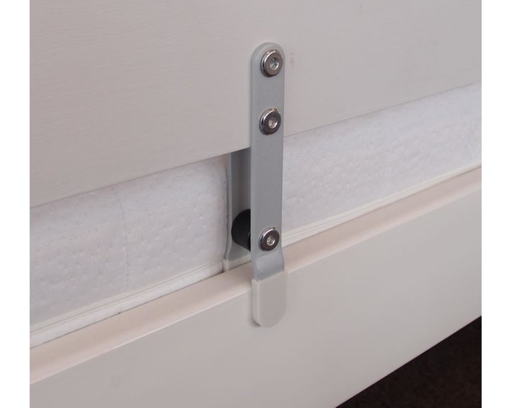Mezi speciálními "packami" tohoto kování se nacházejí integrované gumové válečky, díky nimž můžete nasadit zábranu na desku jakékoli postele o tloušťce 22-25 mm a 44 mm. Povolením nebo dotažením šroubu mezi gumovým válečkem můžeme nastavit zábranu jako kdykoli odnimatelnou nebo naopak pevně připevněnou k posteli.