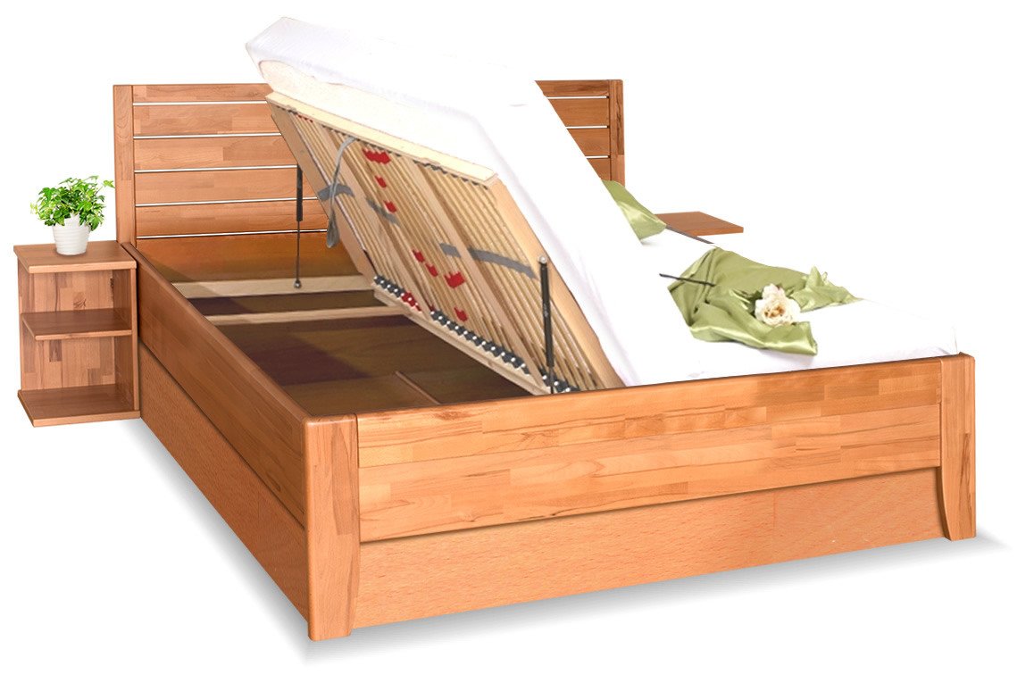 Do úložného prostoru je přístup zajištěn pomocí vyklápěcích lamelových roštů, které jsou součástí ceny postele. Vybírat můžete z bočního a čelního výklopu lamelového roštu. Bočně výklopný rošt zajistí pohodlný přístup do úložného prostoru. Rošt s vyklápěním od nohou - čelní výklop - nabídne také mechanické polohování hlavové části roštu. Vyklápění roštů je zajištěno pomocí kvalitních plynokapalinových pístů. Zvedání a zavírání roštu zvládne opravdu každý bez vynaložení velké síly. Velice praktické u těchto lamelových roštů je možnost nastavení tuhosti v oblasti beder. Rošty jsou položeny na výškově nastavitelném kování v bočnicích a středové výztuze, která je opatřena přídavnou podpěrnou nohou. Nosnost roštu 120 Kg.