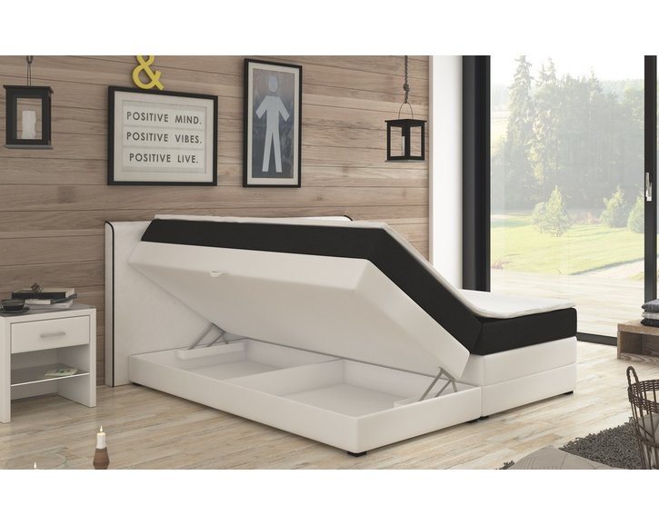 Americká postel boxspring CS89004, s matrací a úložným prostorem, bílá ekokůže/černá látka, 180x200 cm