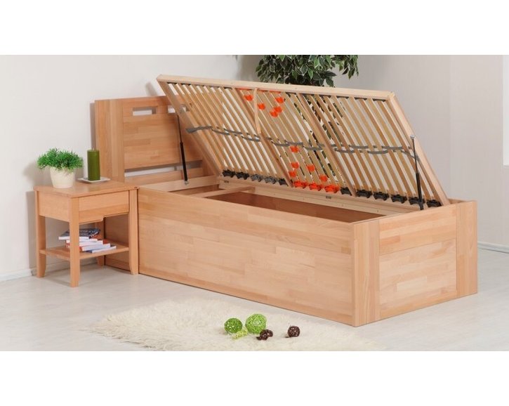 Jednolůžko s úložným prostorem Valencia Senior patří mezi oblíbené modely v našem oddělení postele s úložným prostorem. Tato postel je vyrobena z masivního bukového dřeva v tzv. cinku, nebo-li parketovém provedení ( dřevěné desky jsou vyrobeny slepením menších dílů - parket ). Díky velkému úložnému prostoru, přístupnému pomocí vyklápěcích lamelových roštů plní tato postel funkci praktičnosti a představuje zároveň moderní design.
