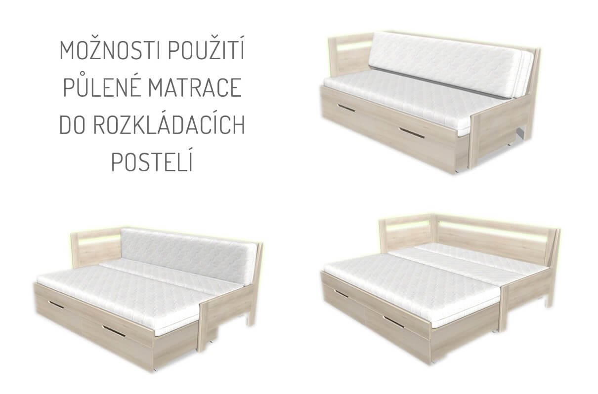 Tuto sadu matrací tvoří hlavní matrace 90x200 cm a půlená matrace 2x45x200 cm. Celková maximální plocha po rozkladu je 180x200 cm. Sada je určena k rozkládacím postelímnapř. Tandem, Tina, Ester, Flexi, Gabriel , Fuego a dalším,které nabízí kombinaci pohodlné pohovky i prostorného lůžka jak pro každodení spaní jedné osoby, tak i přespání dvou osob.