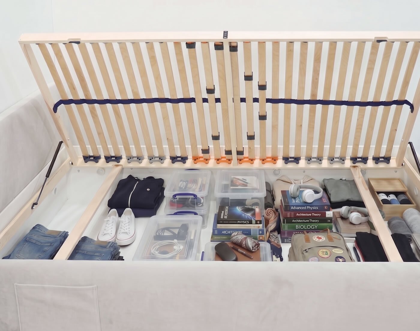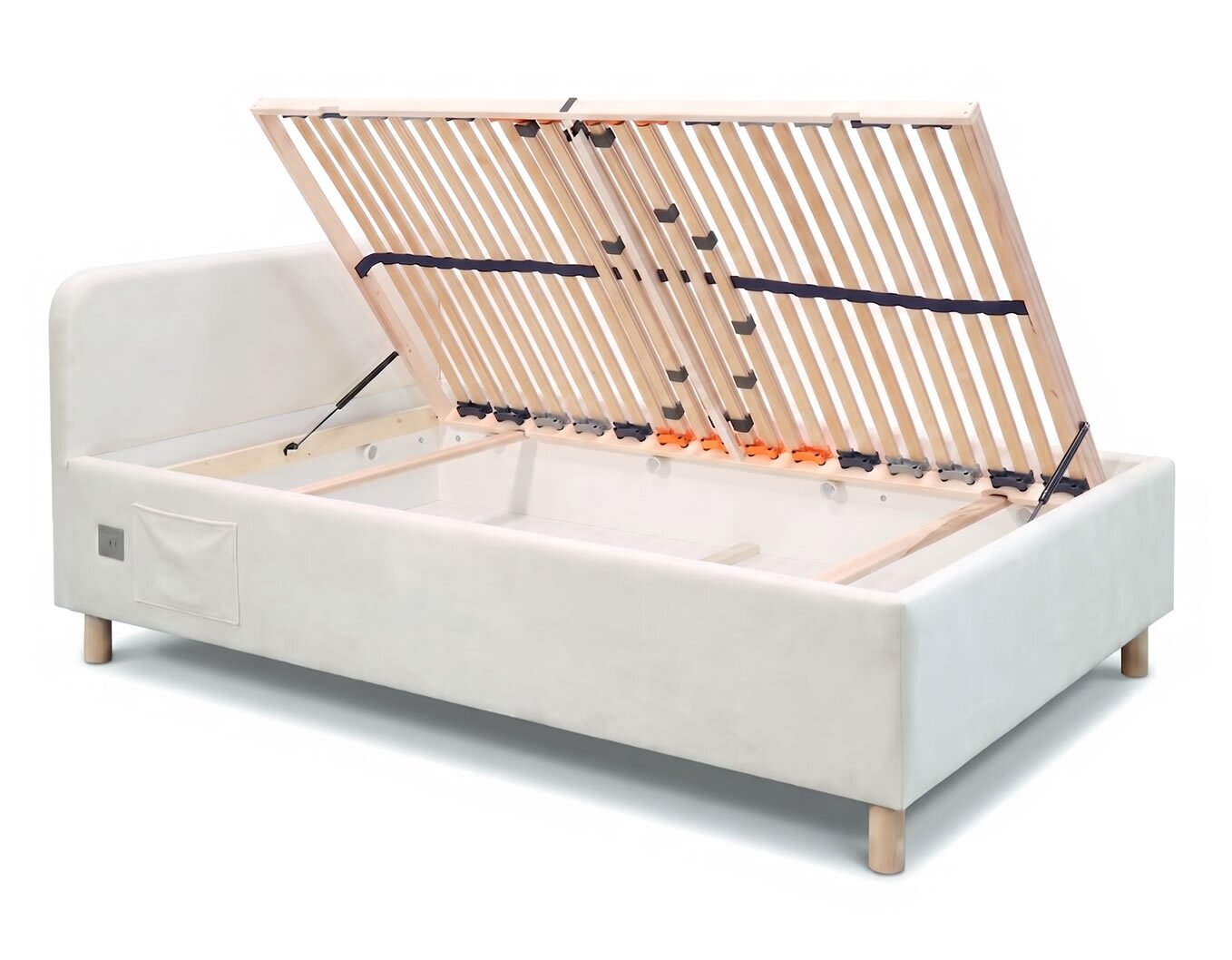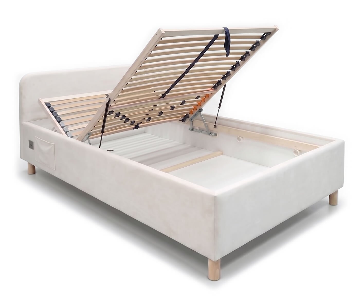 Velkou předností je obrovský úložný prostor, který výrazně pomůže v menších pokojích i ložnicích, kde je potřeba využít každý centimetr. Přístup k úložnému prostoru pomocí výklopného roštu je pohodlný a kvalitní plynokapalinové písty usnadňují každodenní manipulaci. Úložný prostor má nosnost až 20 kg, takže je ideální například na lůžkoviny, sezónní oblečení nebo méně používané věci.