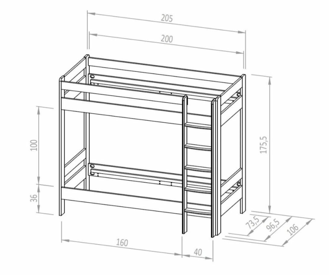 Po smontování je postel Elin naprosto stabilní a pevná, bez jakéhokoli viklání. Je připravena k dlouhodobému používání a každodennímu zdravému spánku. Při použití matrací o výšce cca 16 cm je ložná výška spodního lůžka 45 cm a horního ca 160 cm nad zemí.
