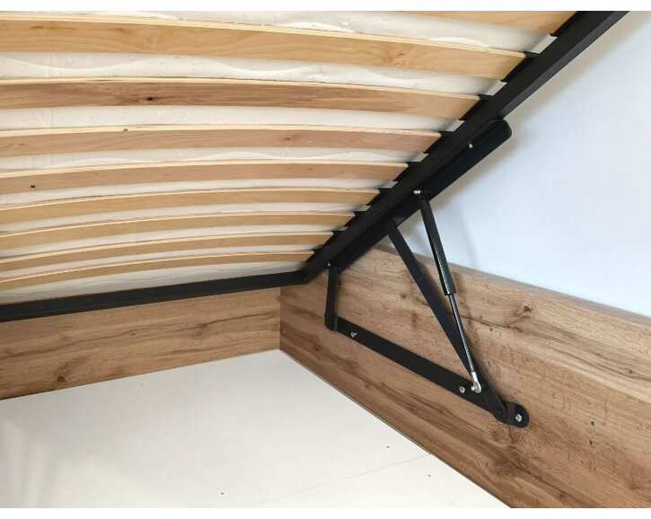 Oceňuji zde možnost výroby nabídky postele v několika rozměrech a barevných dezénech, takže dobře zapadne do jakéhokoli interiéru. Tloušťka materiálu 2,2 cm a použité ABS hrany dávají této posteli předpoklady pro dobrou pevnost a dlouhou životnost. Zvedání roštu na pístech je velmi snadné a zvládl jsem pohodlně jednou rukou.