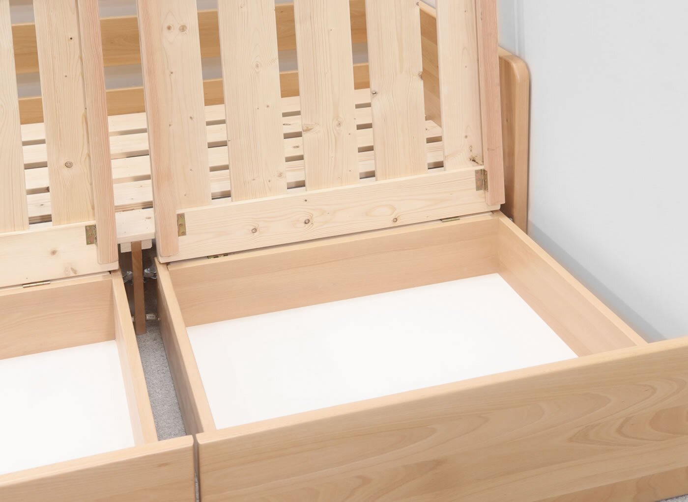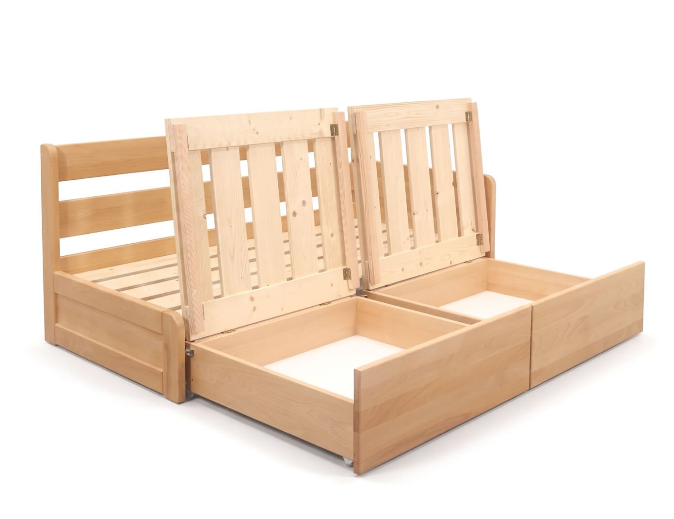 Pouhým potažením přední části k sobě a bez vynaložení velké síly jsem postel snadno vysunul a otočením spodních latěk lehce rozložil. Použitím pevných silných smrkových roštů je docíleno velké nosnosti a musím s radostí konstatovat, že postel je vhodná i pro každodenní rozkládání.