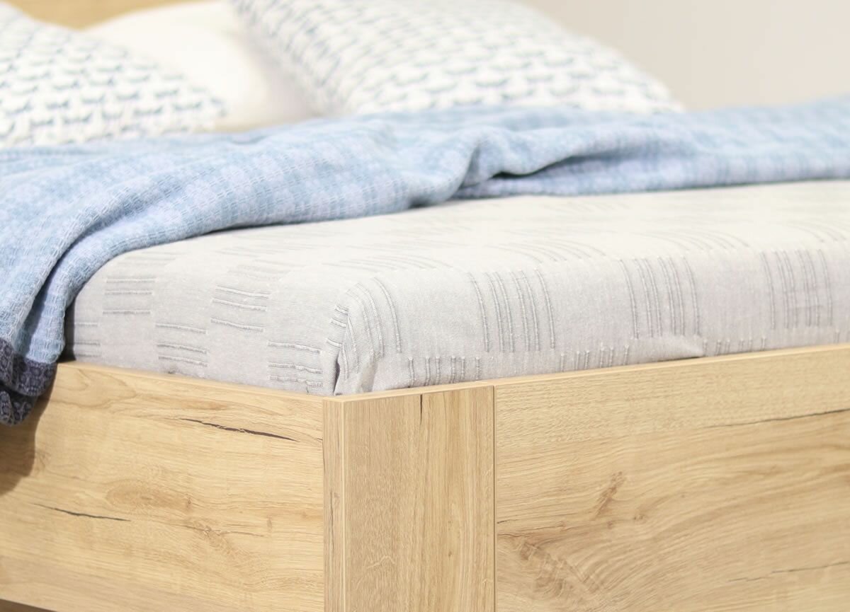 Rám postele je zhotoven z kvalitního 2,5 cm silného lamina. Všechny viditelné hrany jsou chráněny ABS hranou tloušťky 2 mm, která je vysoce odolná vůči nárazům a opotřebení. Okraje jsou navíc jemně zabroušeny – na dotek jsou tedy hladké a příjemné.