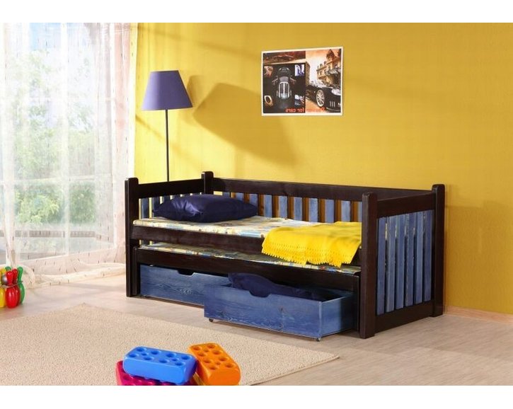 Tato rozkládací postel s přistýlkou a úložným prostorem Filip je vyrobena z masivní borovice. Povrchová úprava je provedena přírodním atestovaným lakem. Povrch materiálu je lehce strukturovaný.Na přání je možno provést moření dle zobrazeného vzorníku ( Na obrázku namořeno na wenge/modrá).