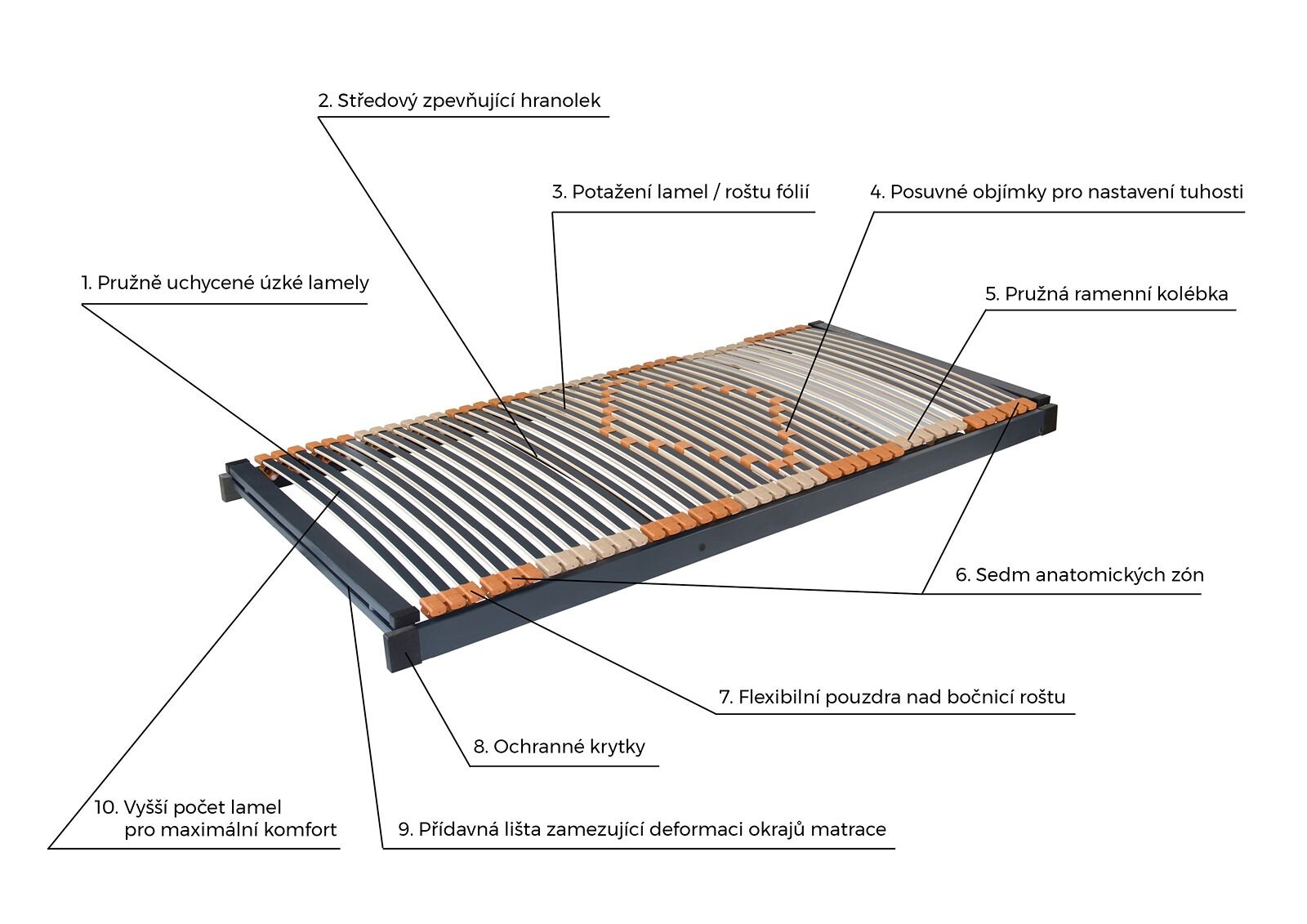 • 42 lamel pro precizní oporu: Vysoká hustota úzkých lamel zaručuje, že rošt citlivě reaguje na každý váš pohyb. Čím více lamel, tím lépe dokáže rošt rozložit váhu a nechat vyniknout ortopedické vlastnosti vaší matrace.