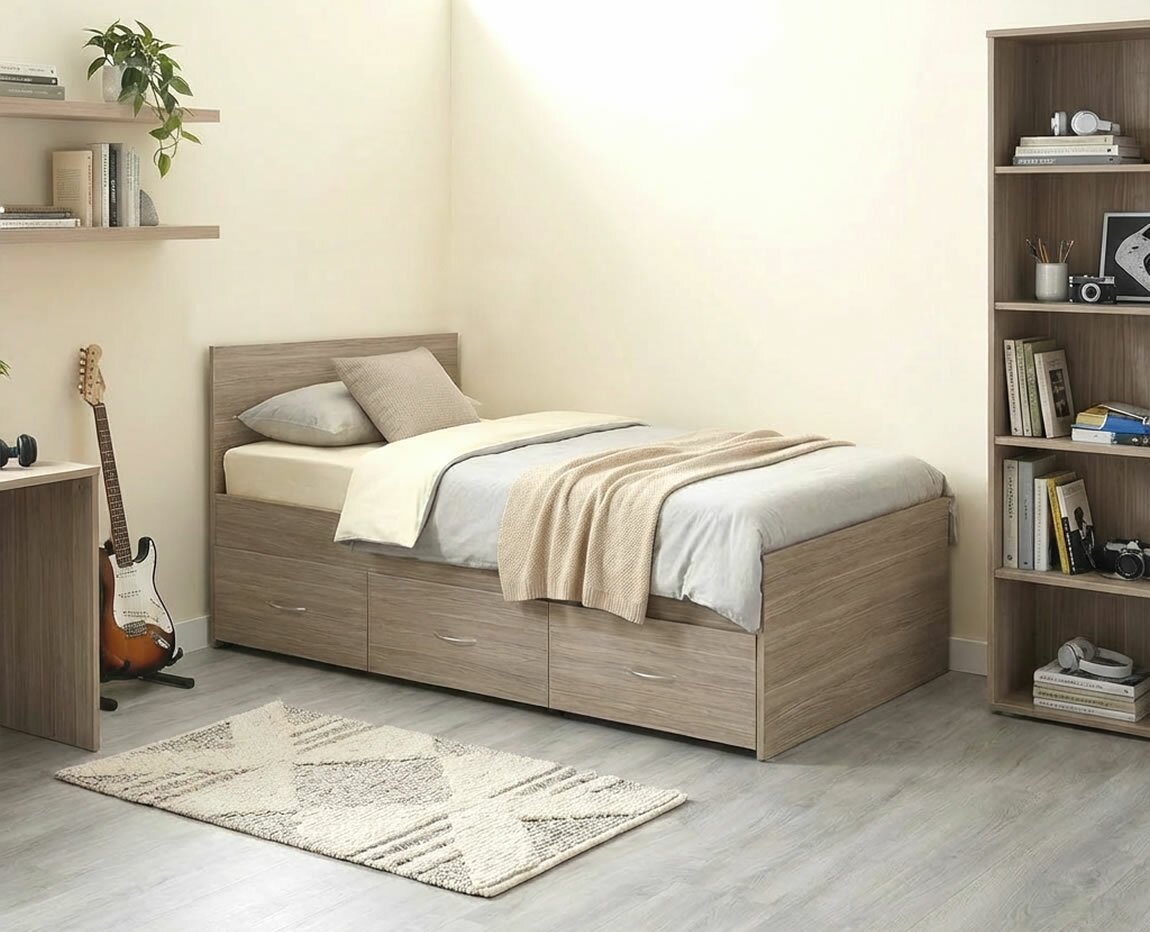 Zvýšená postel Delta je vyrobena z laminované dřevotřísky a nabízí možnost výběru z více barevných dezénů.