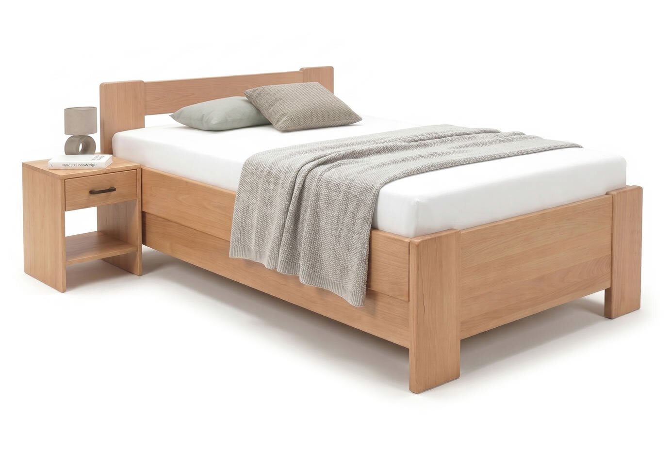 Postel s hlavovým čelem MIVA představuje dokonalé spojení robustnosti a elegance. Je vyrobena z prvotřídního bukového masivu o síle 4 / 2,5 cm v průběžném provedení, což zaručuje nejen nádhernou kresbu dřeva bez rušivých spojů, ale především extrémní stabilitu.