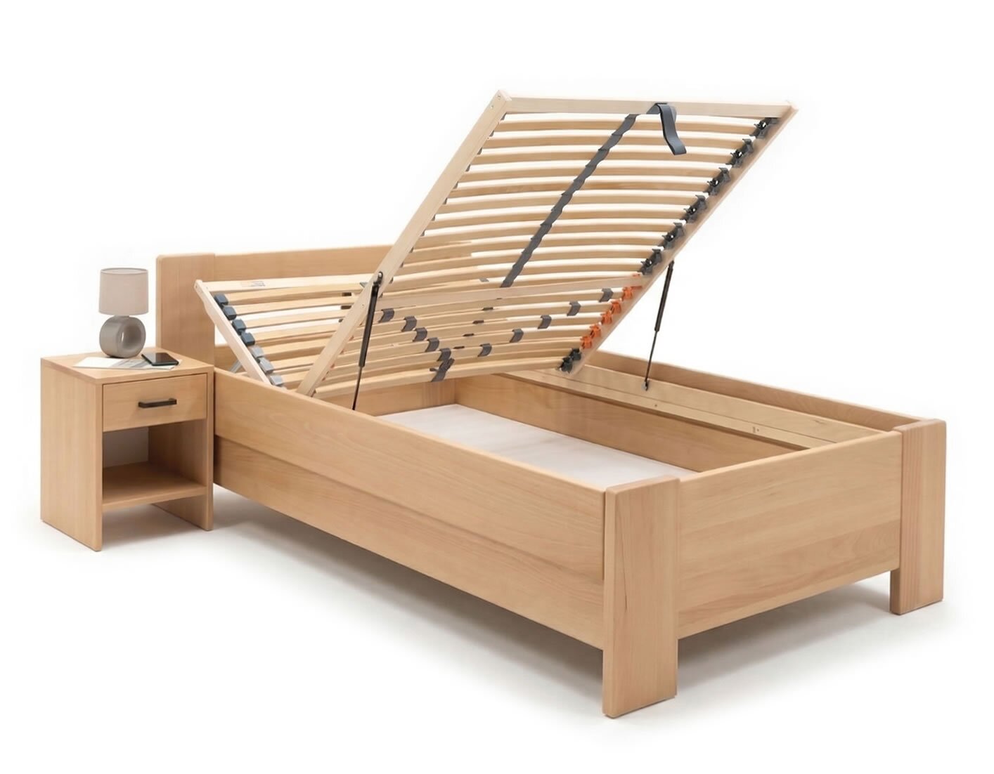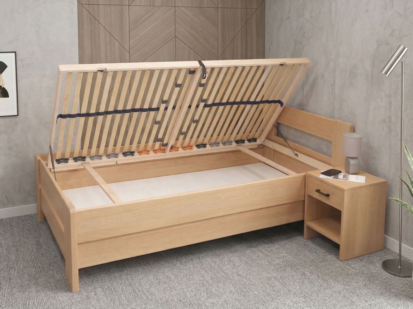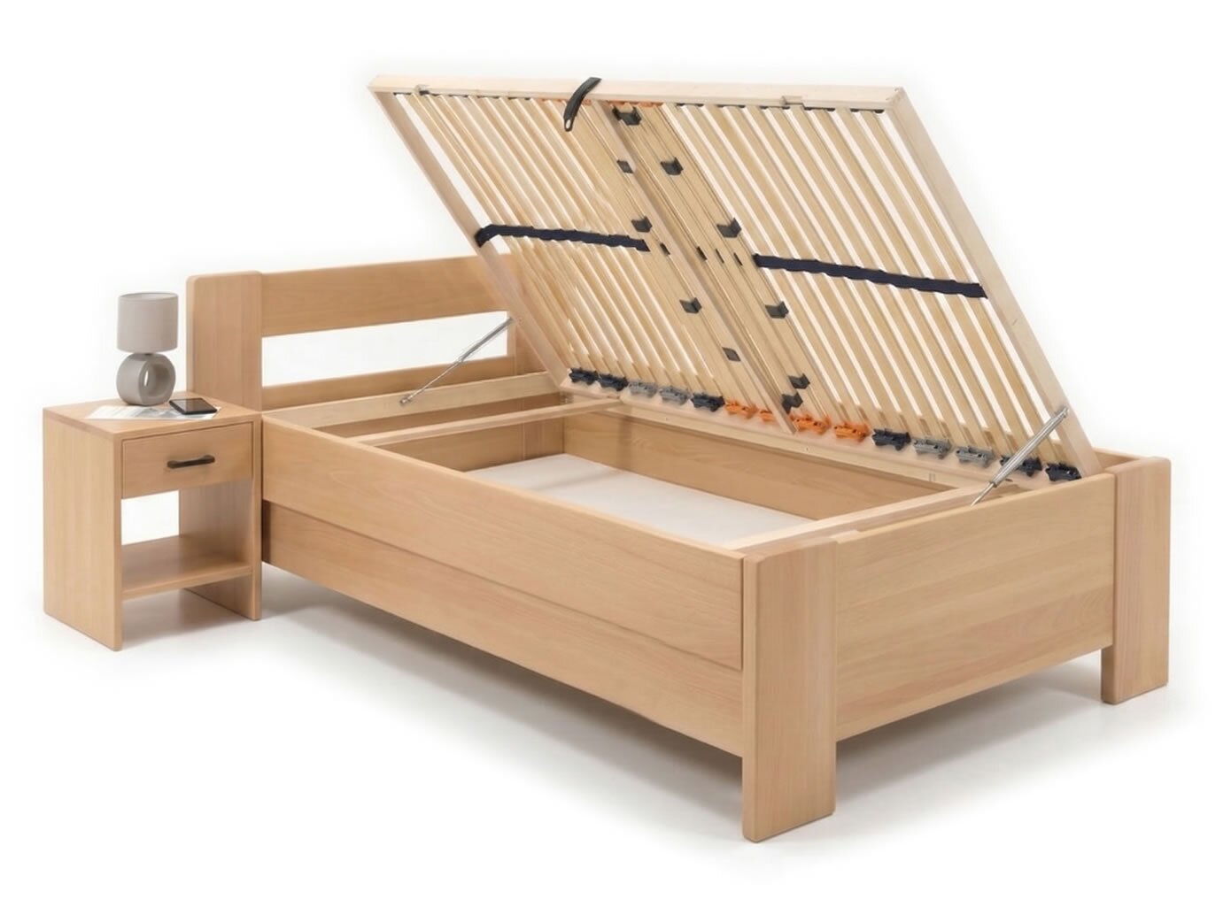 • Hluboký úložný prostor a rošt v ceně: Postel disponuje ca 22 cm hlubokým úložným prostorem a součástí ceny je vyklápěcí rošt s čelním nebo bočním výklopem.